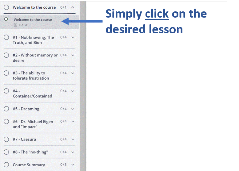 Navigation through course materials is very intuitive and simple. Simply click on the desired lesson in the left menu. You can also move forward and backward once you complete a lesson.